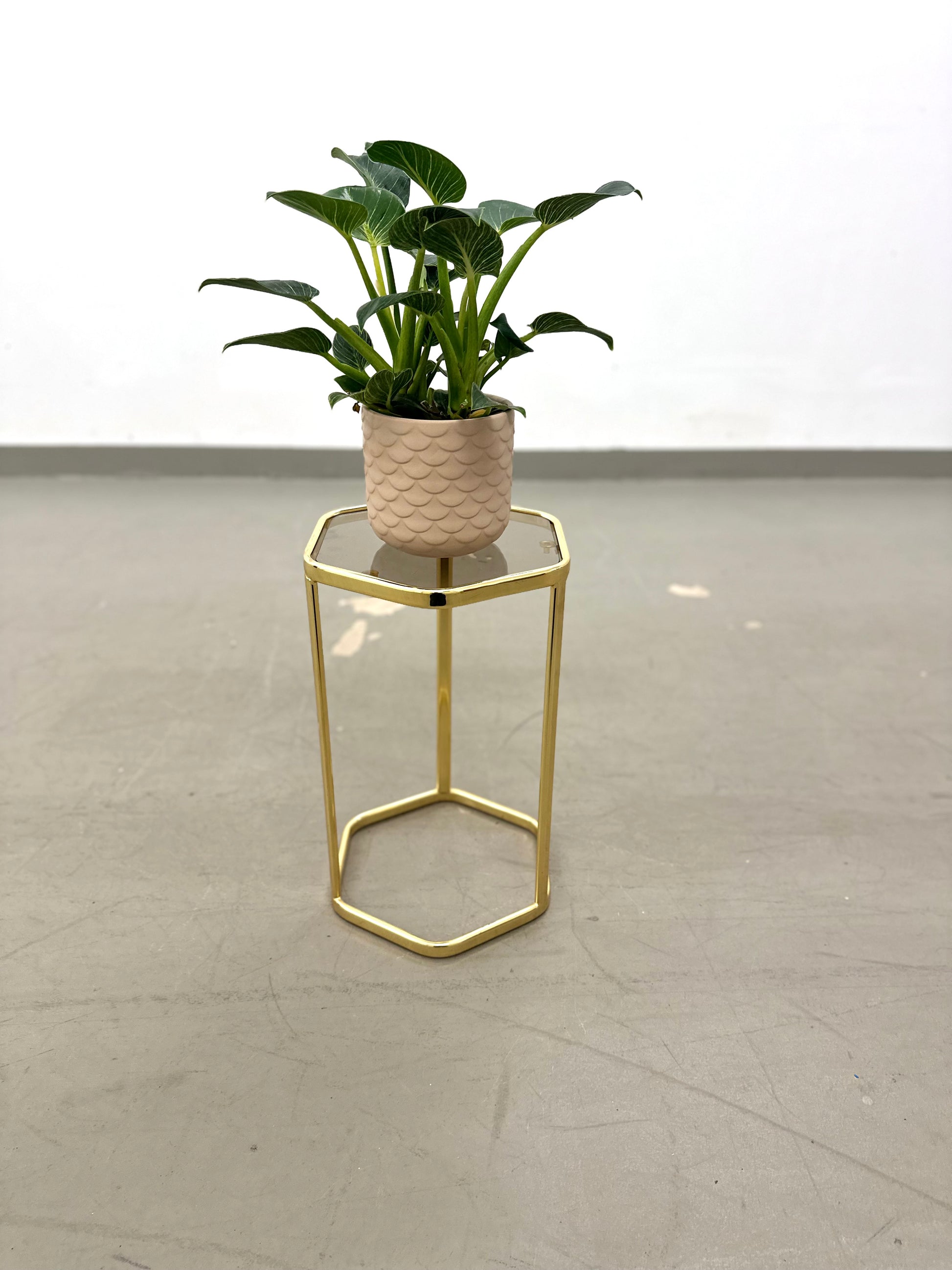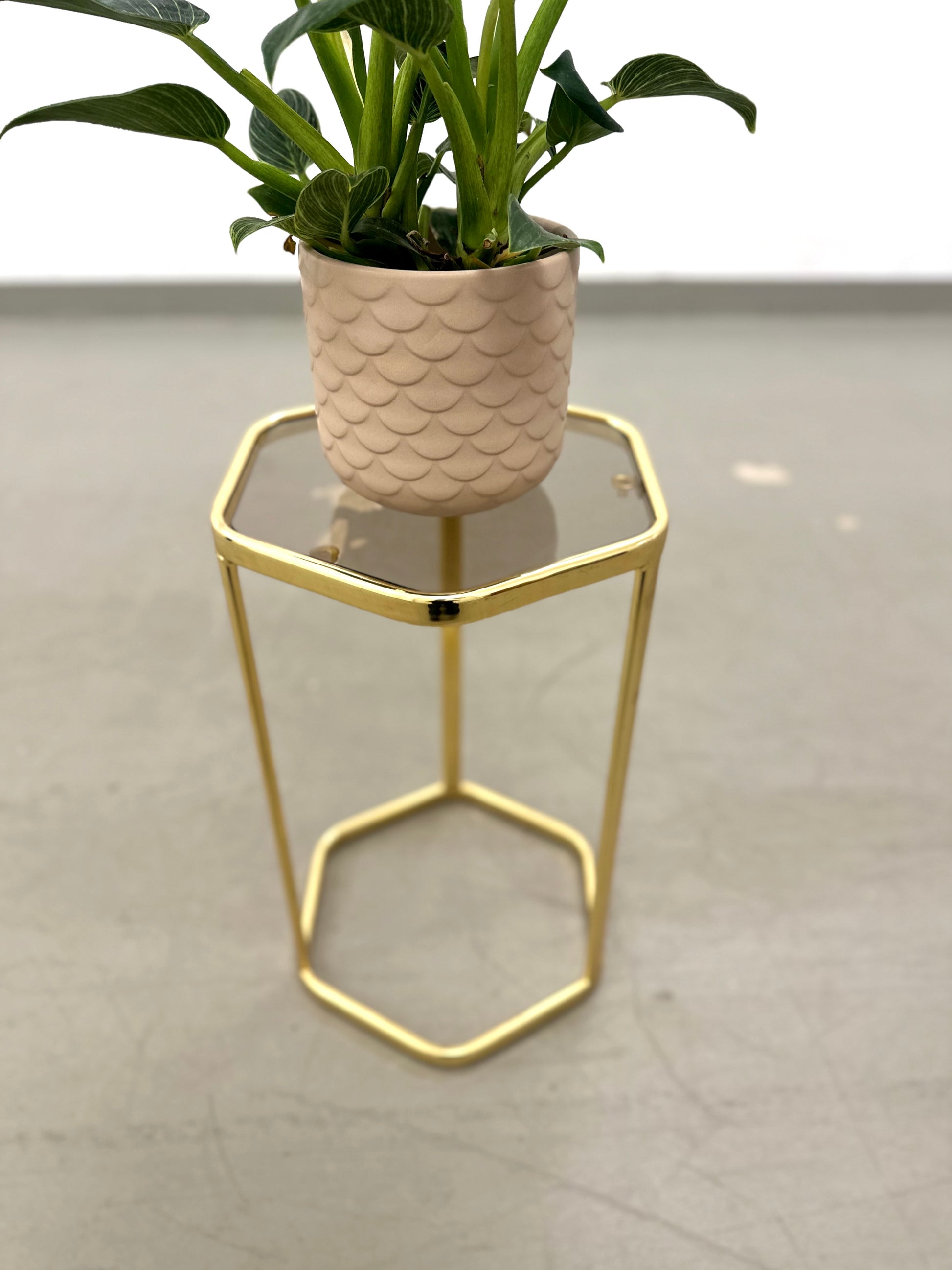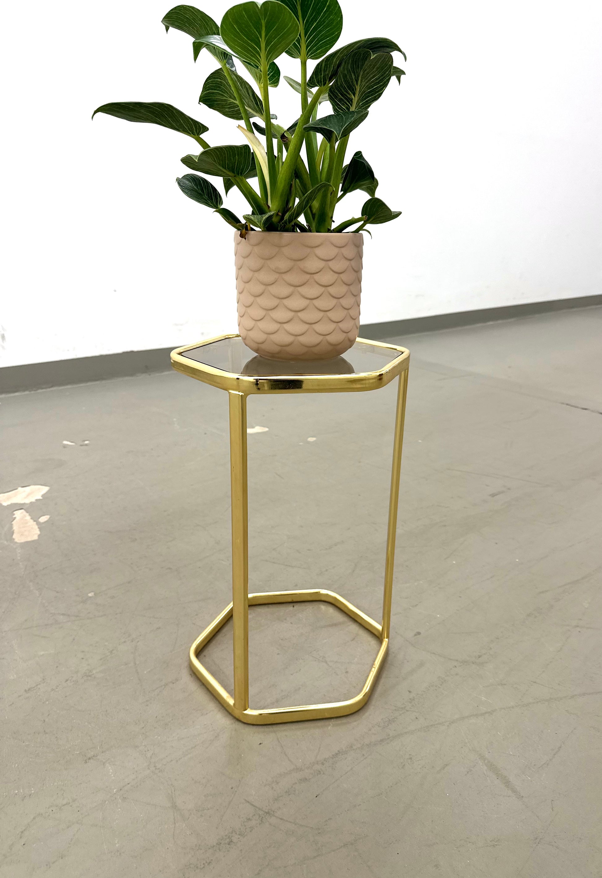 Beistelltisch / Pflanzenständer mit goldfarbenem Metallgestell und Rauchglas, hergestellt in den 70er/ 80er Jahren.