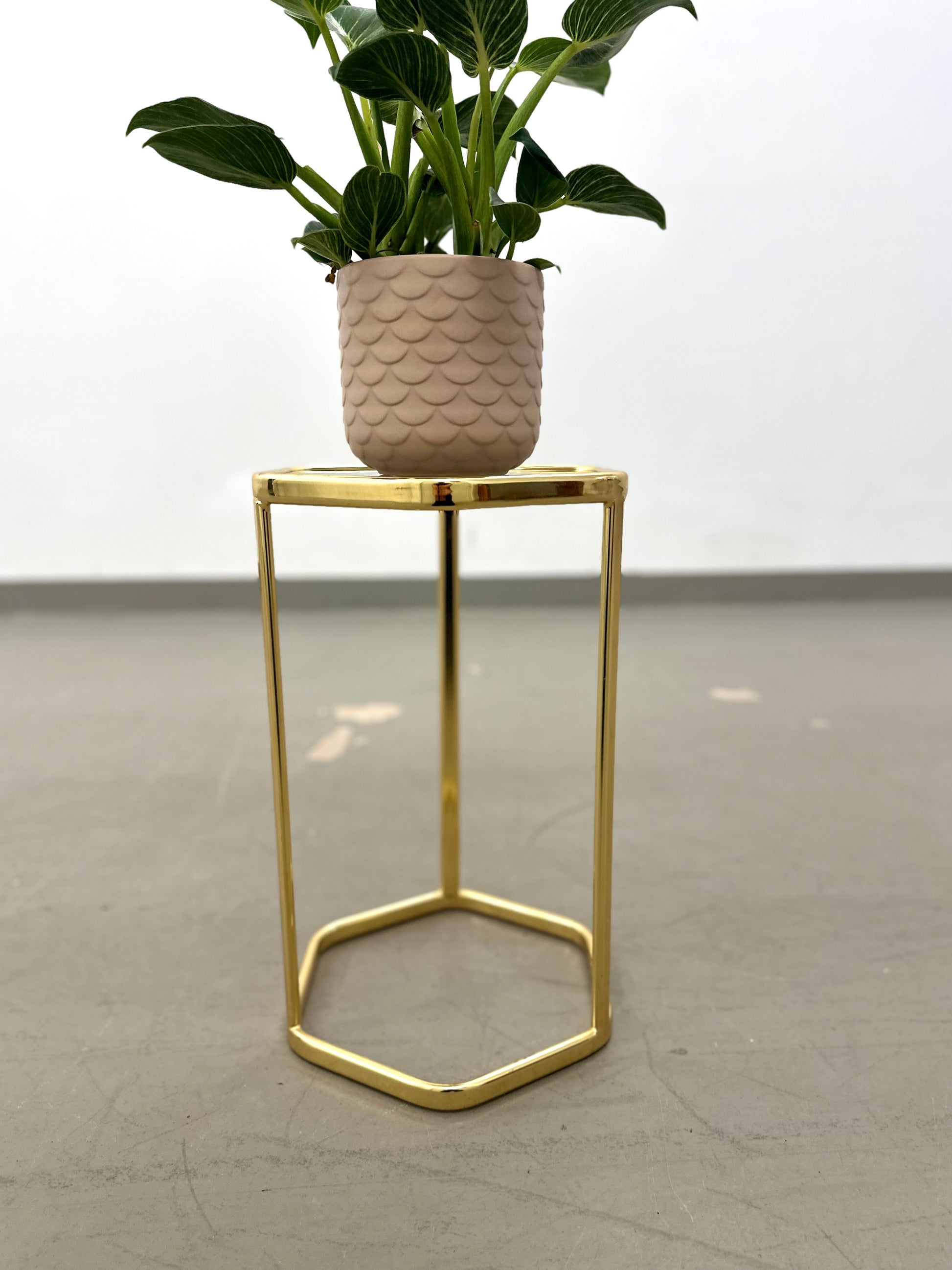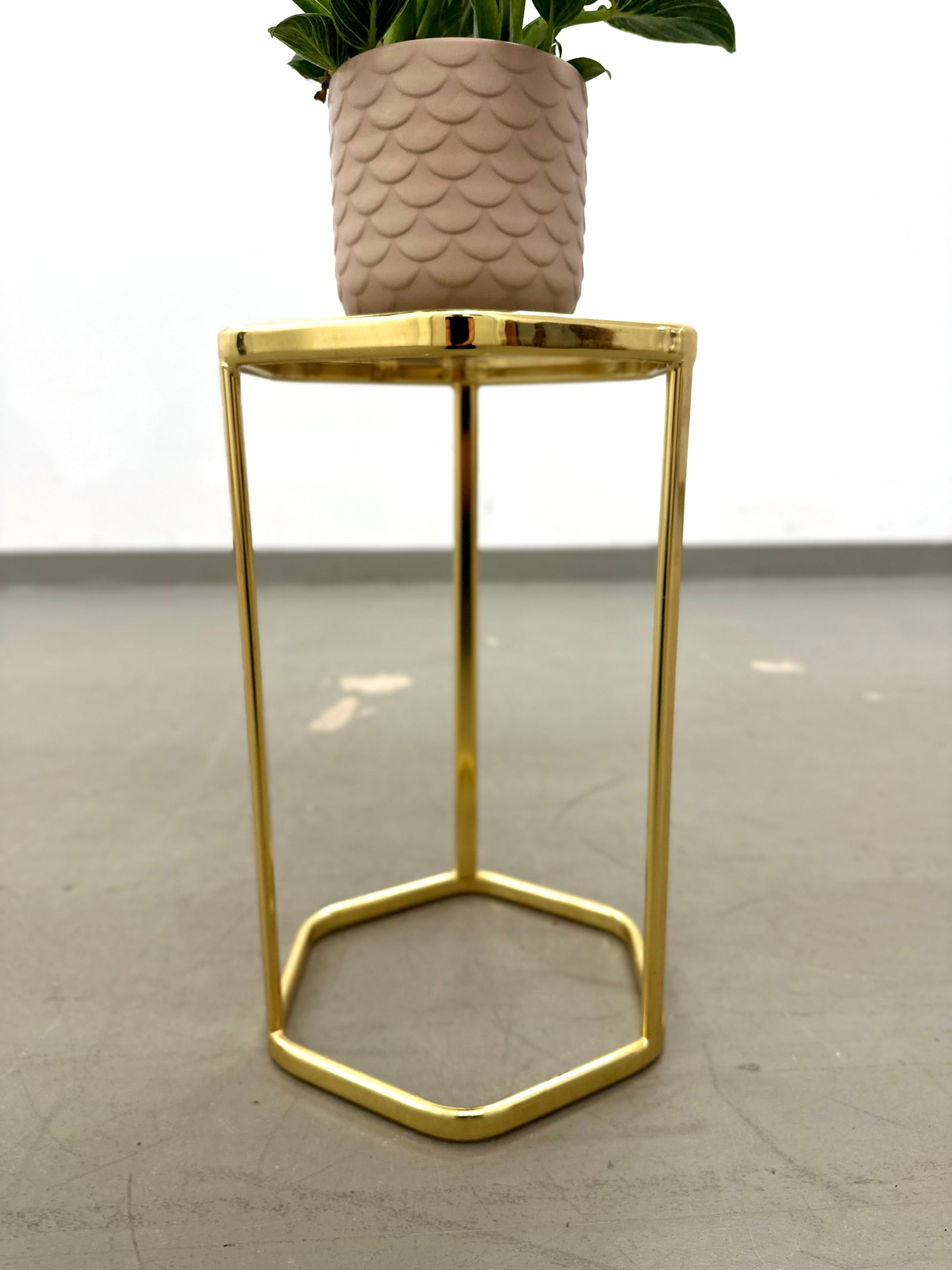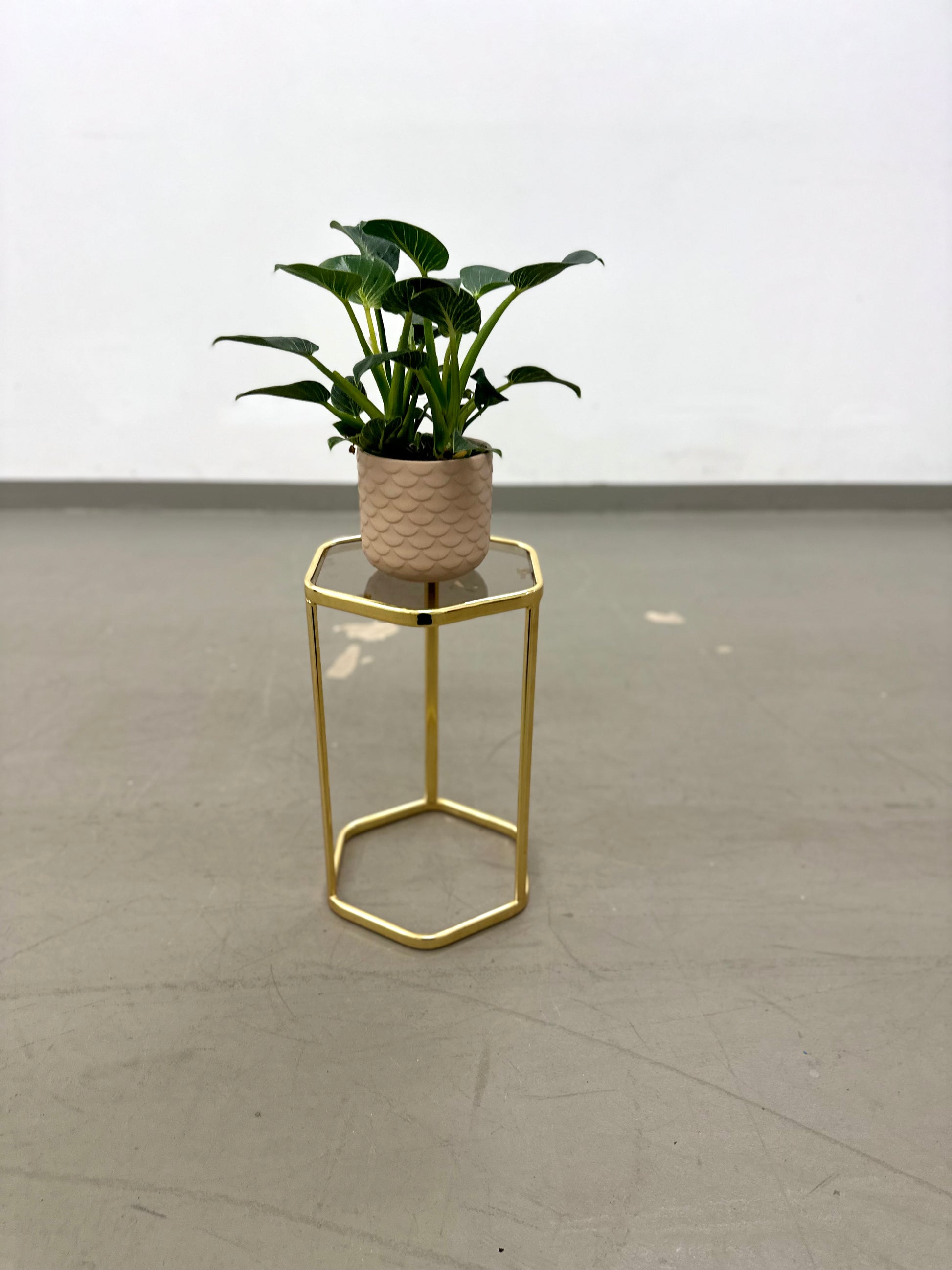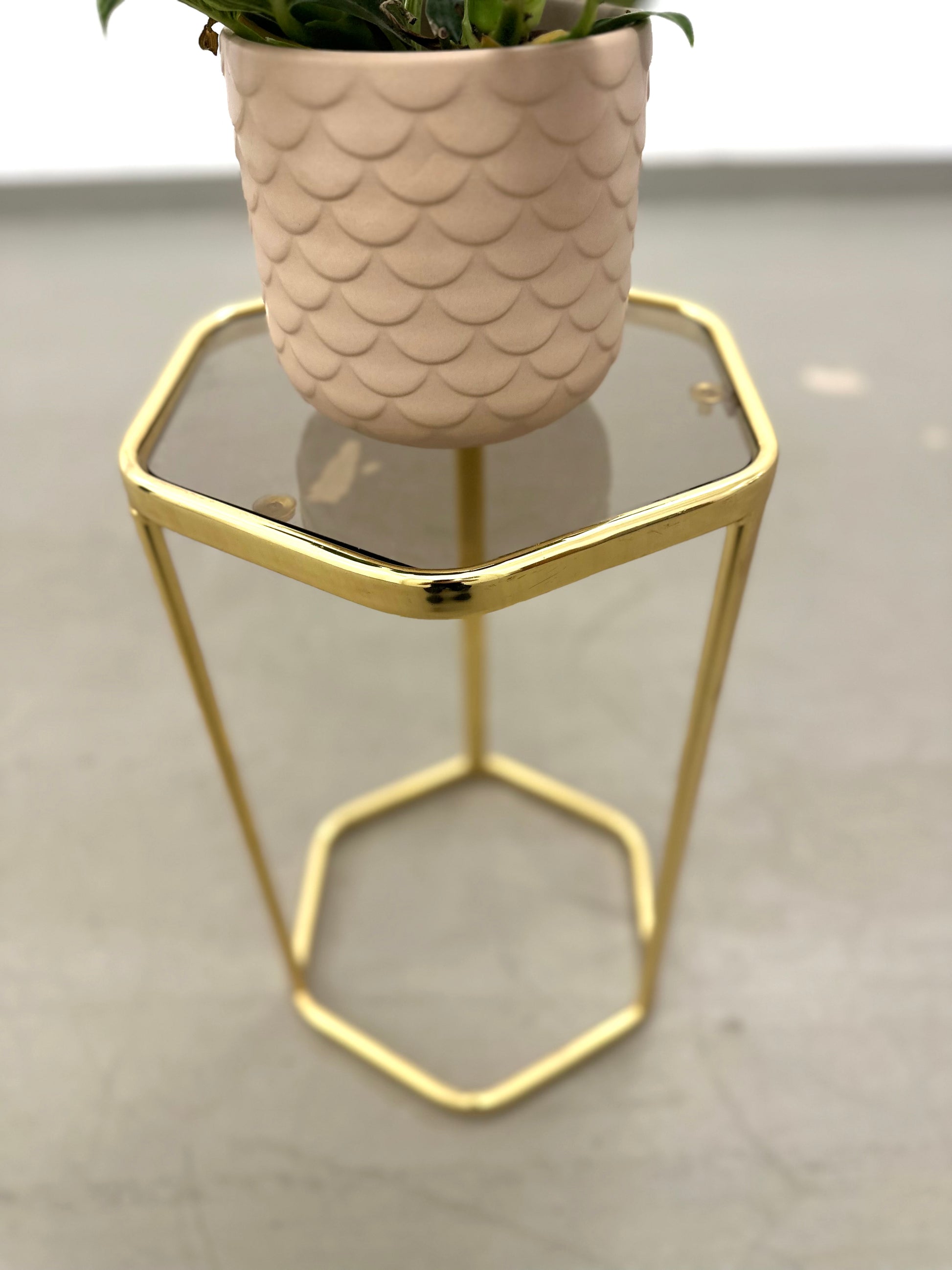 Beistelltisch / Pflanzenständer mit goldfarbenem Metallgestell und Rauchglas, hergestellt in den 70er/ 80er Jahren.
