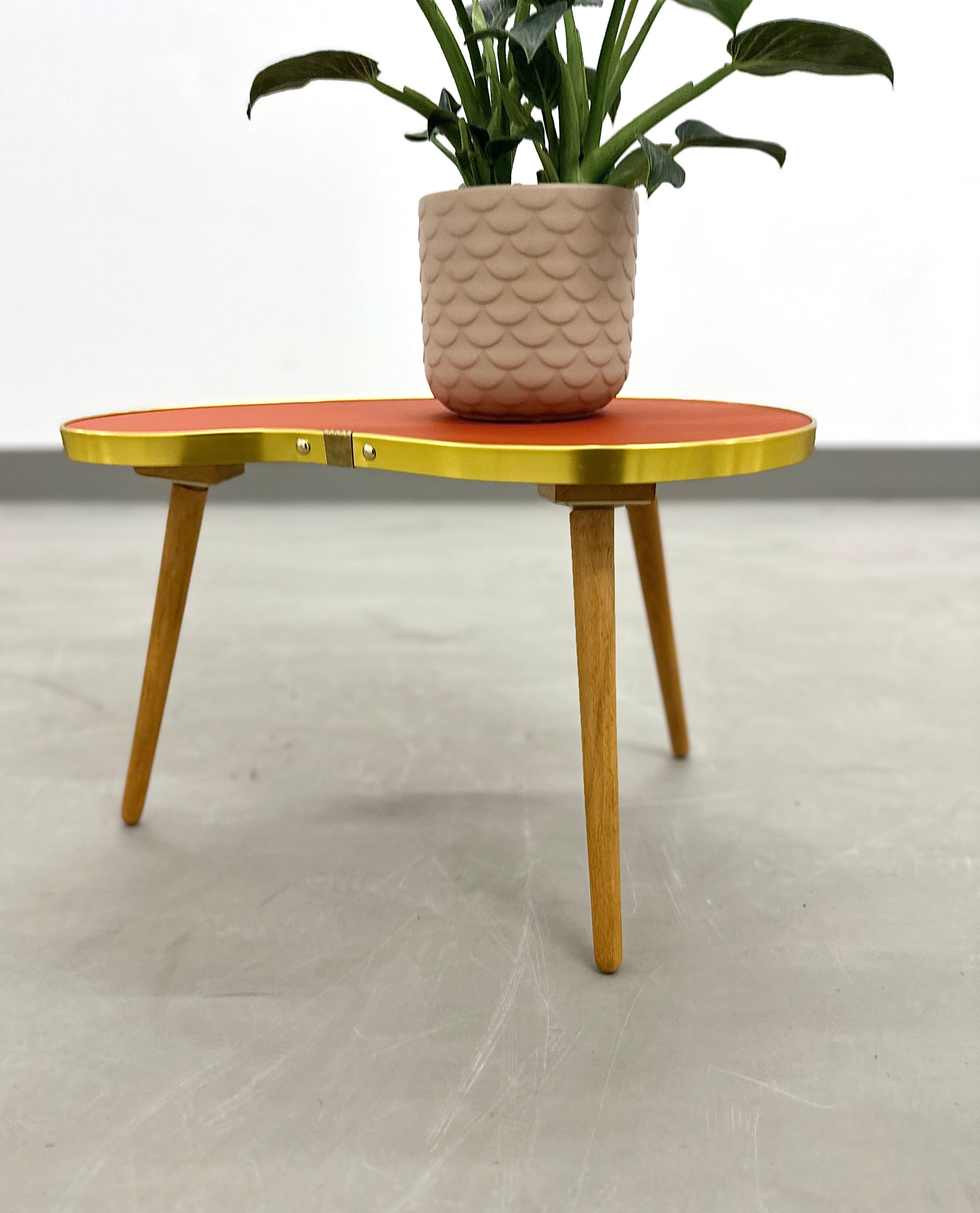 Die Tischplatte ist in Nierenform gestaltet und mit einer orangefarbenen Oberfläche aus Kunstleder bezogen.