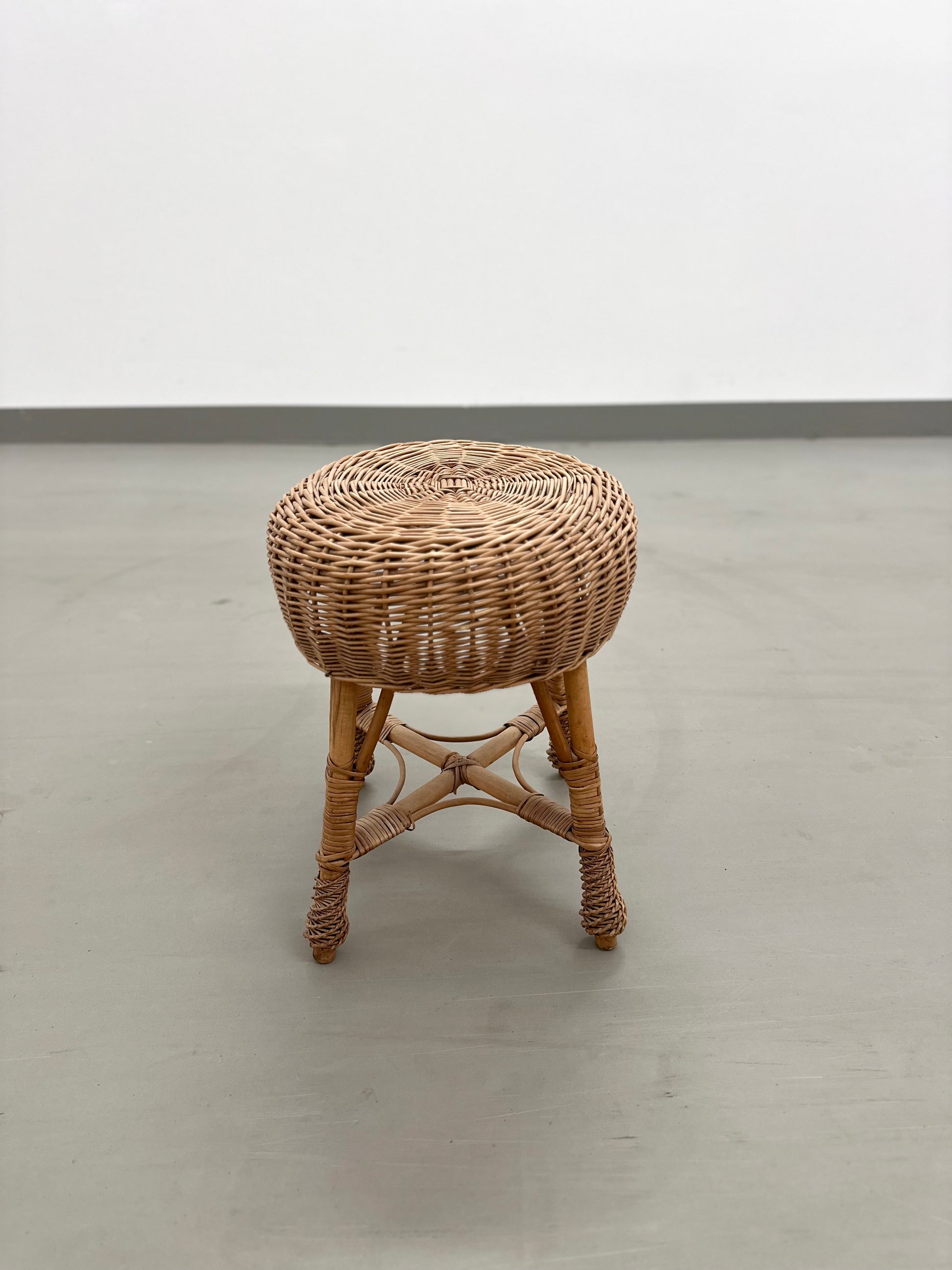 Der Hocker ist in einem guten Zustand und zeigt altersbedingte Gebrauchsspuren am Rattan auf.